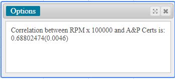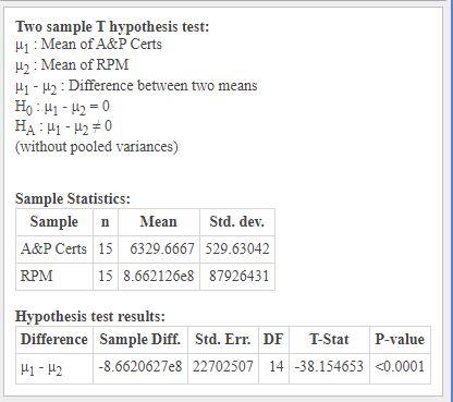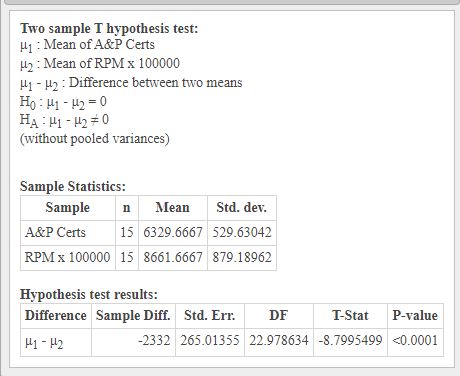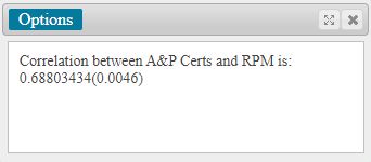 The results of the test were not unexpected but the strength of the results was surprising as the p-value was very low, according to Statcrunch it was <0.0001, for both tests ran, see figures 2 and 3 in the appendix. This makes them statistically significant, in addition to the t-test, a correlation test was conducted, it determined that the correlation between the two sets of data was 0.688 with a p-value of 0.0046. It was run for both the truncated RPM value and the complete number and the results were the almost identical in the correlation value whereas the p-value was the same, see figures 4 and 5 in the appendix. The results show there is a strong correlation between RPM and the issuance of original A&P certificates.