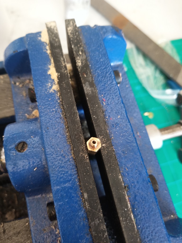 In addition to reprofiliing the threads and enlarging the discharge port, other internal modifications need to be accomplished. The retaining plug for the pin needs to be drilled out to increase flow and the pin itself must be modified for a thinner stainless steel shaft. I drilled the retaining plug out to 0.190 which still allows the use use of the allen key for removal.