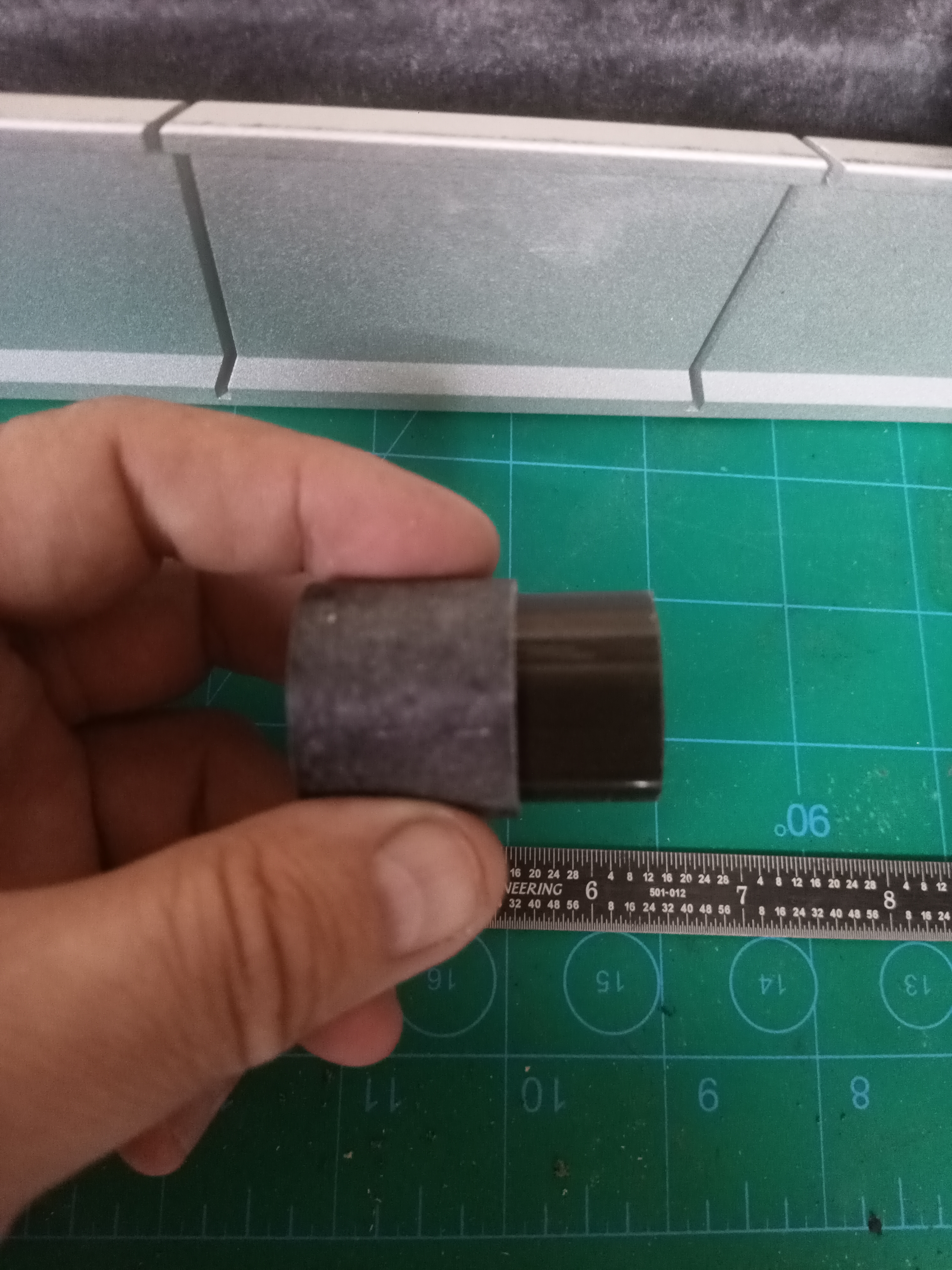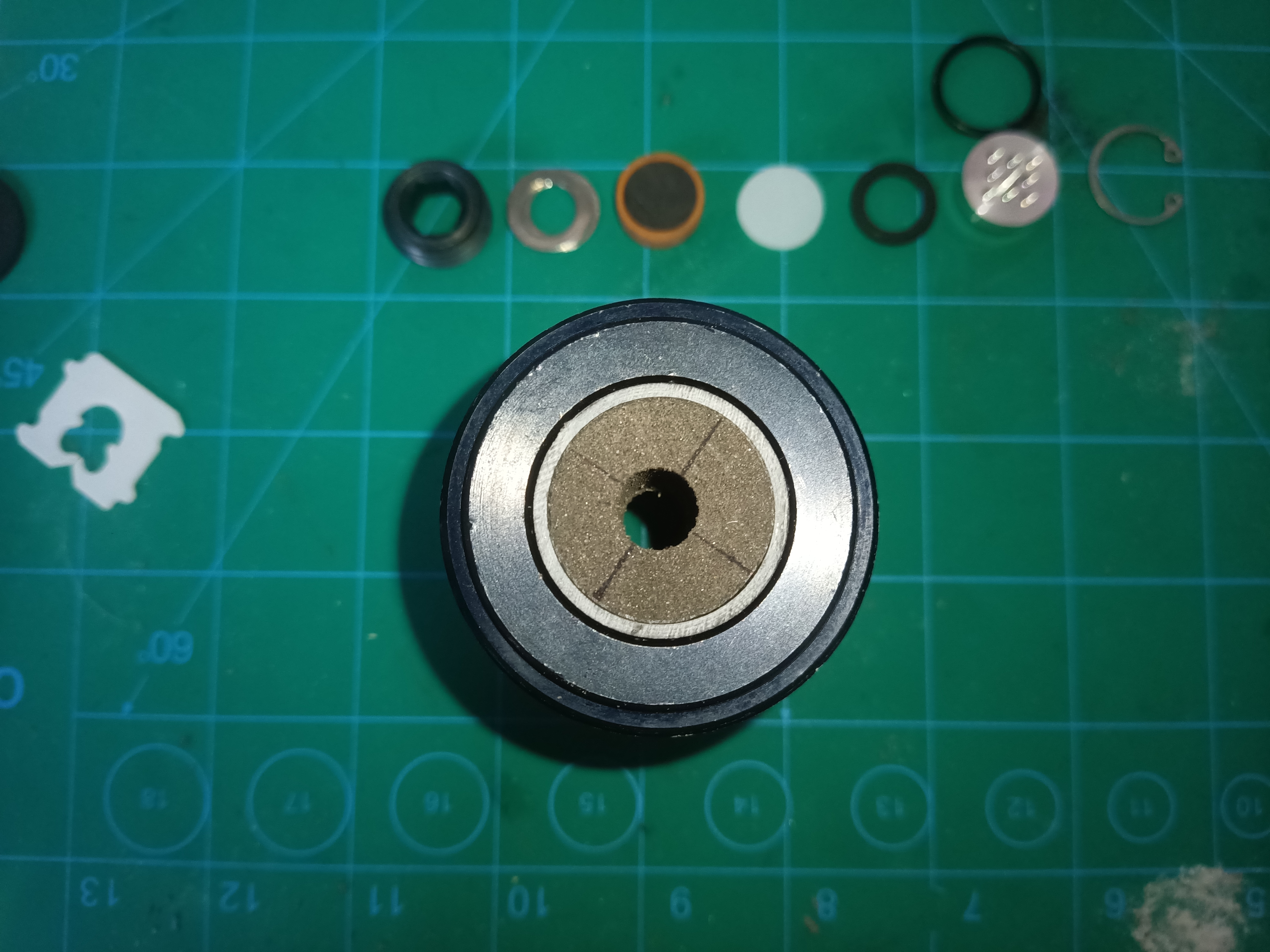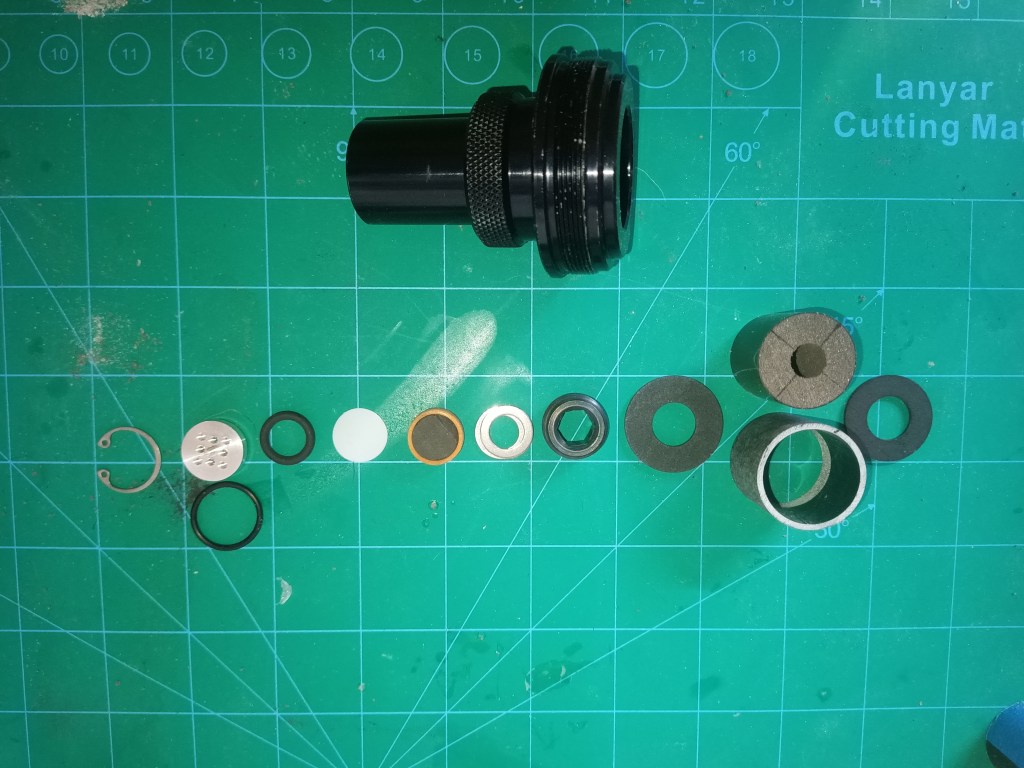From left to right: internal snap ring, injector and o-ring, nitrous o-ring, 0.010 teflon sealing disc, pyrovalve, 2 x 0.032 stainless washers, allen plug, forward insulator, preheater grain and insulator, aft forward insulator. A little bit more preparation than the standard Aerotech motor but not too complicated. The forward closure is now complete. The forward and aft preheater grain insulators are still available from Seastrom but for a single use product they are rather pricey at 3.35 each. I suspect they are made of fish paper, an electrical insulator, and could probably be made out of sheets of fish paper and cut out with a laser cutter if you have access to one. I have already made the SVG file and have access to a glowforge so I will try and cut some out.
