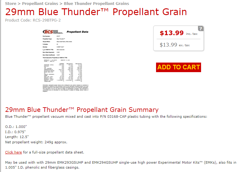 I ordered two of the Blue Thunder propellant grains, the way HAZMAT shipping works I figured why not. But ordering 12 inch lengths of the grain is very economical. The correct grain is shown below.