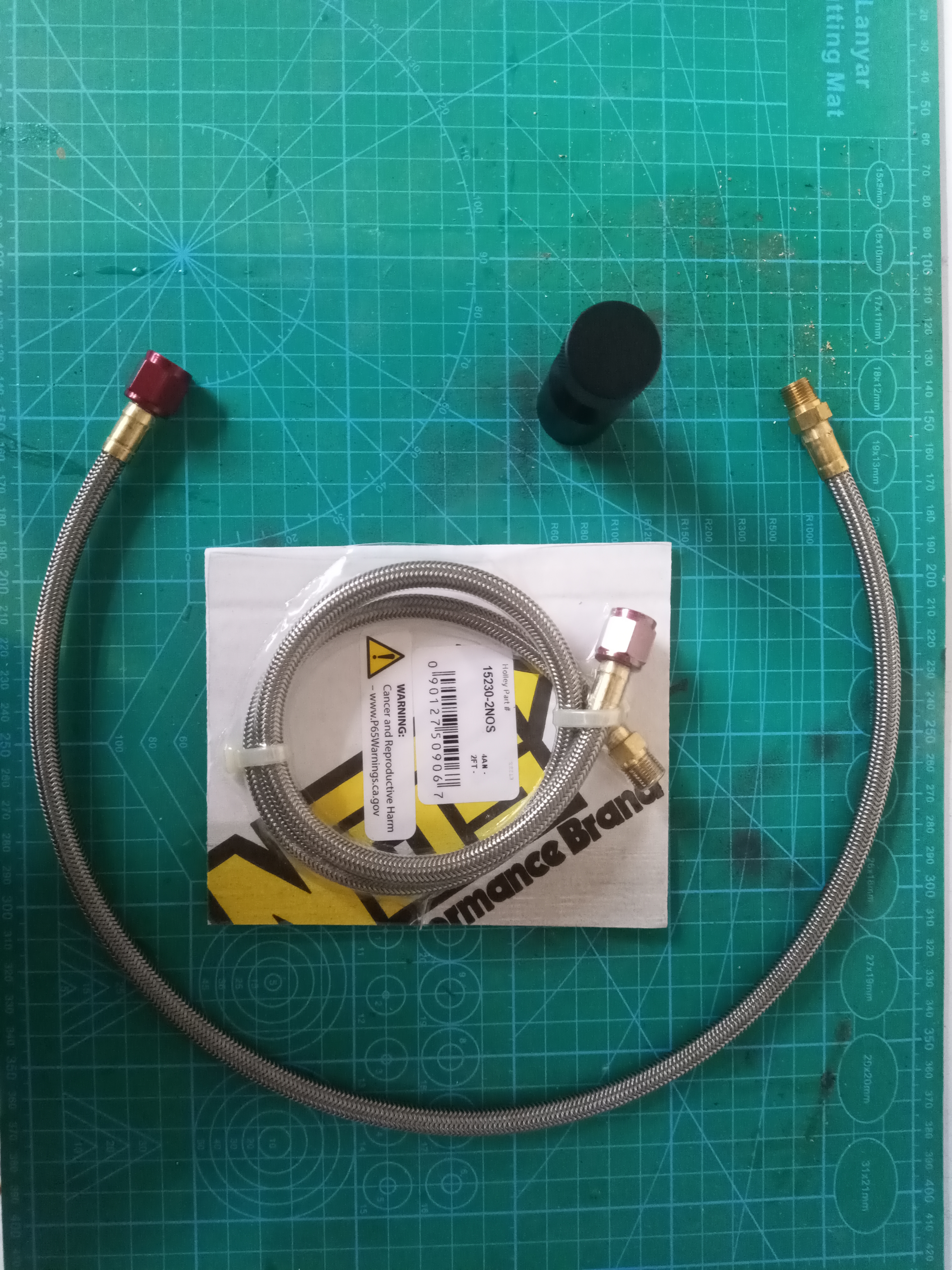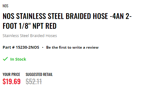 The fill adapter for the tanks can be made from off the shelf components. The fill hose can be obtained from Holley which is one of the listed suppliers in the data pack. There are two types, and the only difference is the color on the fitting, blue or red. The red is supposed to signify fuel lines when attached to a carburetor but it is half the price of the blue colored one. It has a 1/8 NPT on one end and a 4AN on the other for attachment to the supply tank. A longer one is available if you decide to go that route.