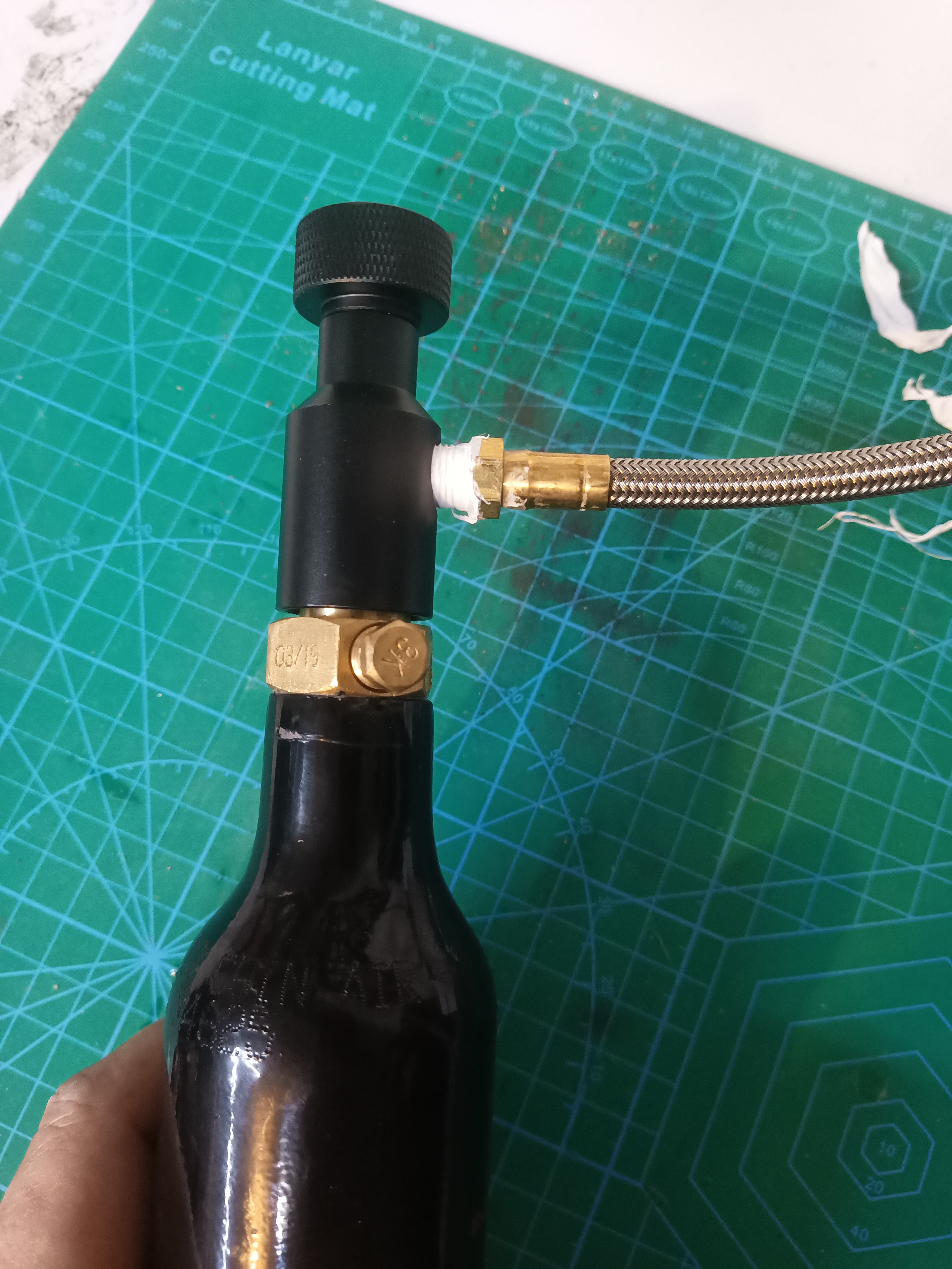 A 7/16 wrench is required to tighten the fitting. Teflon tape helps, do not forget to do a leak check to prevent any issues during filling. The other end will attach to your supply tank of your choice.