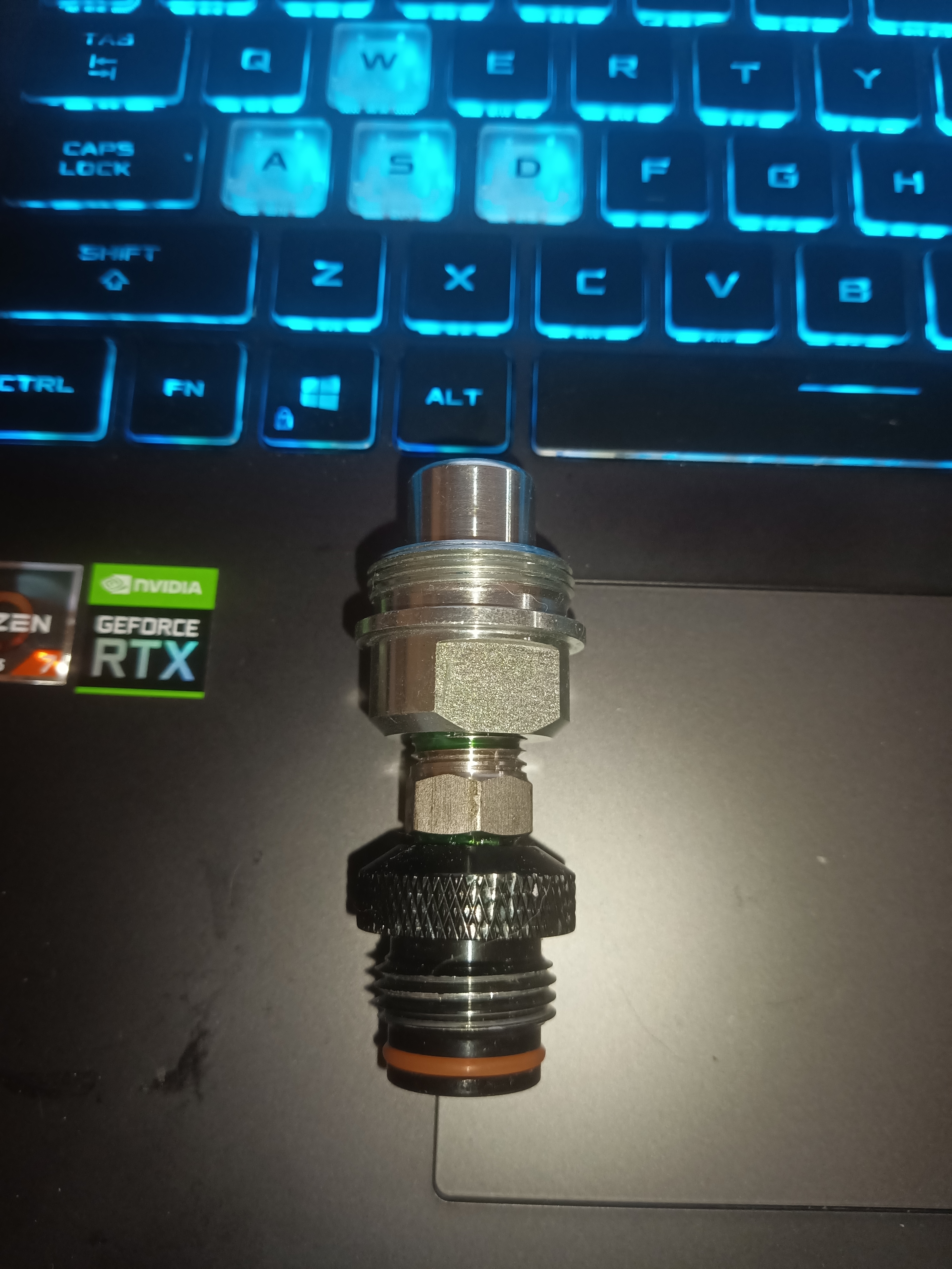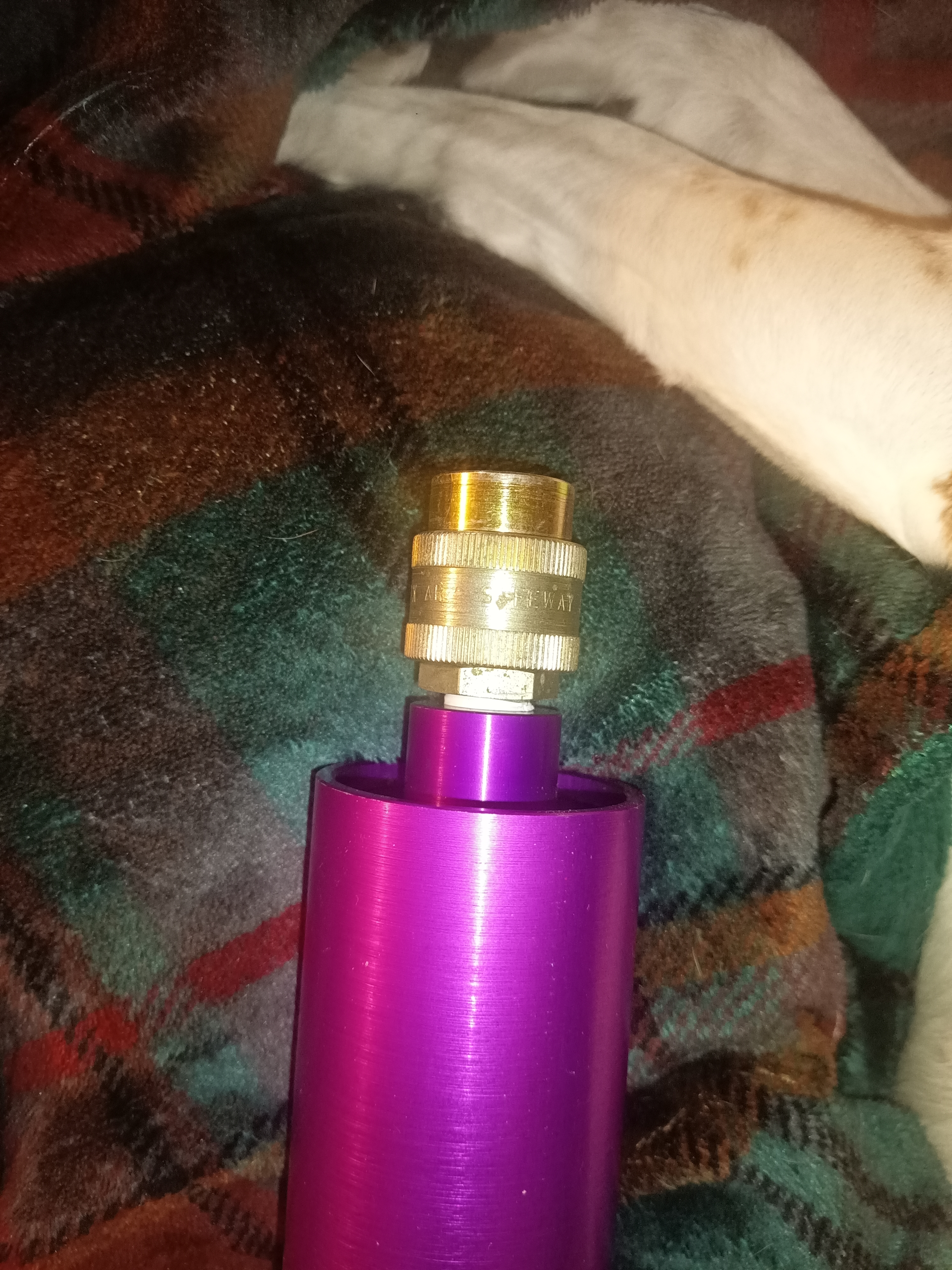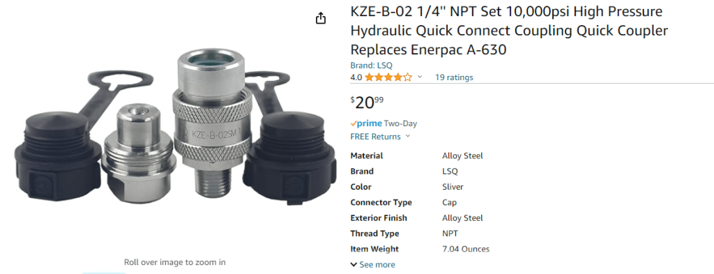 Previous posts addressed rethreading a paintball valve to 13/16 x 14 from the 1/2G x 14. This was quite adequate but my lack of a lathe led to me other options. This led me to look at another hybrid that is also out of production. The owner of Alpha Hybrids reached out to me when I started this project and donated some of his original hardware. His design also uses off the shelf hardware. After checking out his motor I chose to utilize a combination of both the Aerotech and Alpha design. I modified a paintball bulk tank connector and an agriculture style hydraulic connector, both available from Amazon.