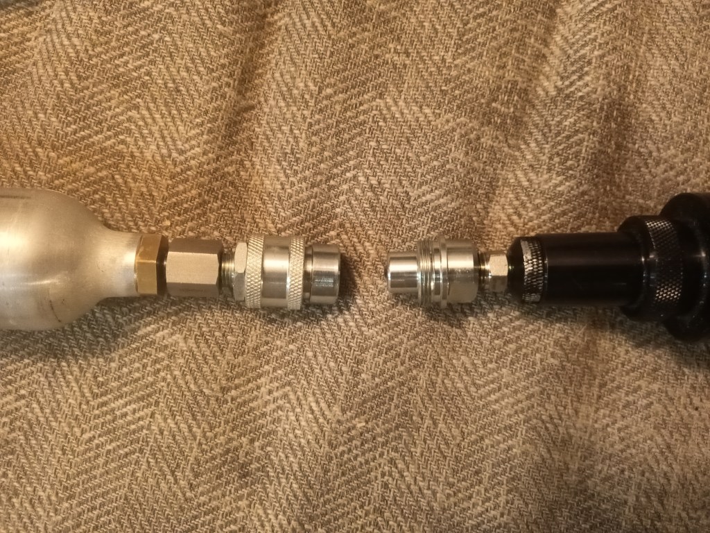 I found this to be about the safest option while not having to worry about the nipple on the injector engaging the pin valve on the the tank. It also ensures a safe coupling and disconnect to prevent launching a a flight tank inadvertently after filling and replaces the earlier ball valve option which could have been dangerous if procedures were not followed.