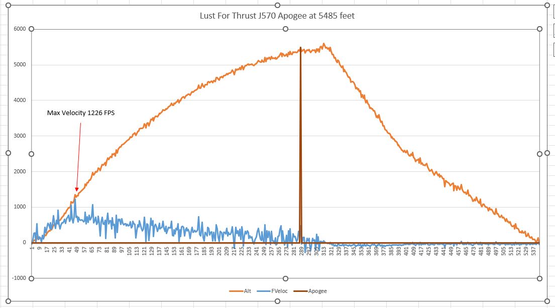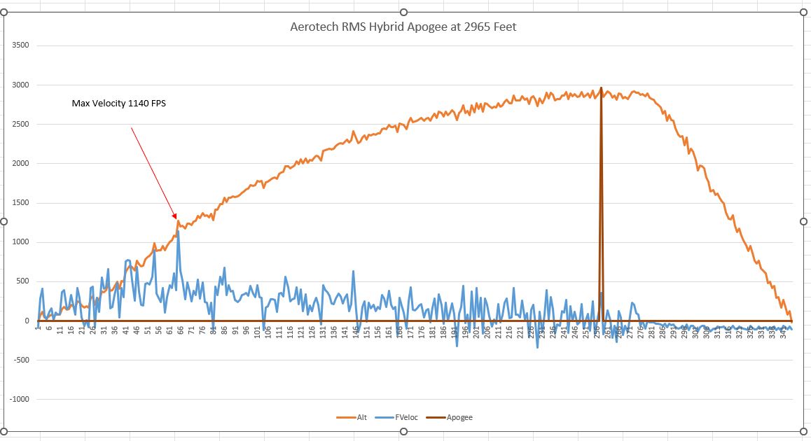 The rocket flew quite well on a J570 the previous day. I wanted to use a commercial motor that was close to the same length as the RMS hybrid as possible to make sure the weight and balance would be within safety margins. The flight went up to 5485 feet.